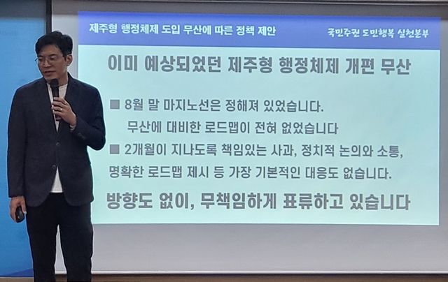 국민주권 도민행복 실천본부는 28일 제주도의회 도민 카페에서 기자회견을 열고 "제주형 행정체제 개편이 무산된 후, 2개월이 지나도록 무책임하게 표류하고 있다"며 "한시정원 36명과 임기제 공무원 2명 등 무리하게 인력을 증원한 총 53명의 인력과 인건비 44억원과 관련 사업 예산 192억원을 합한 236억원의 예산 등 전대미문의 행정력과 예산 낭비가 지속되고 있다"고 지적했다.