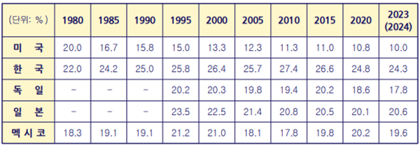 제조업 강국이라 할 수 있는 한국·독일·일본은 물론이고 멕시코도 제조업 비중이 20% 안팎을 꾸준히 유지한 반면, 미국의 경우 1980년에 20%이던 수치가 2024년에 10%로 반동강이 나고 말았다. (독일·일본은 1990년대 이후부터 관련 데이터 활용 가능. 2024년 데이터가 아직 공개되지 않은 나라의 경우 2023년 데이터를 활용하였음)