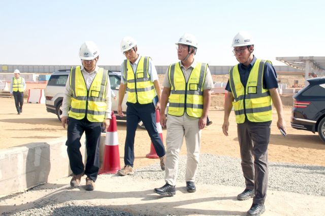 정의선 현대차그룹 회장(앞줄 왼쪽)이 사우디를 방문해 현지 법인 ‘HMMME’의 생산 공장 건설 현장을 둘러보고 있다. 현대차그룹 제공.