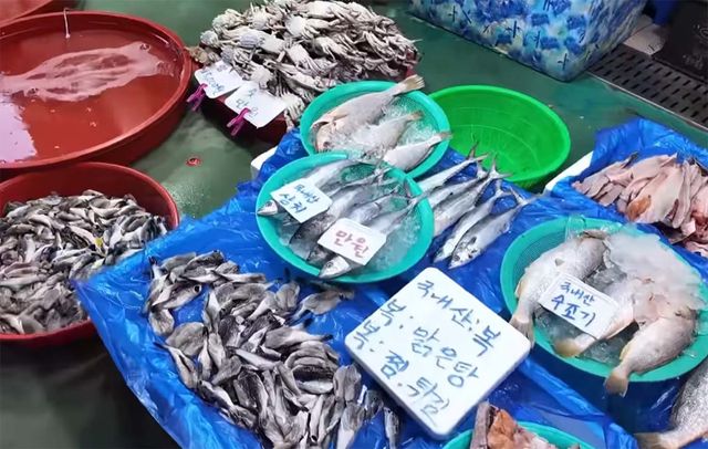 그 외에도 삼치나 민어 등의 선어류가 많았다. 자연산 참돔도 보였다. 국산 참조기는 씨알이 자잘했다. 영상 제작자는 "작은 사이즈의 참조기보다 차라리 황석어로 불리는 황강달이를 더 추천한다"며 "비슷한 씨알이면 맛도 비슷한데 좀 저평가돼서 가격도 더 저렴하다"고 말했다.