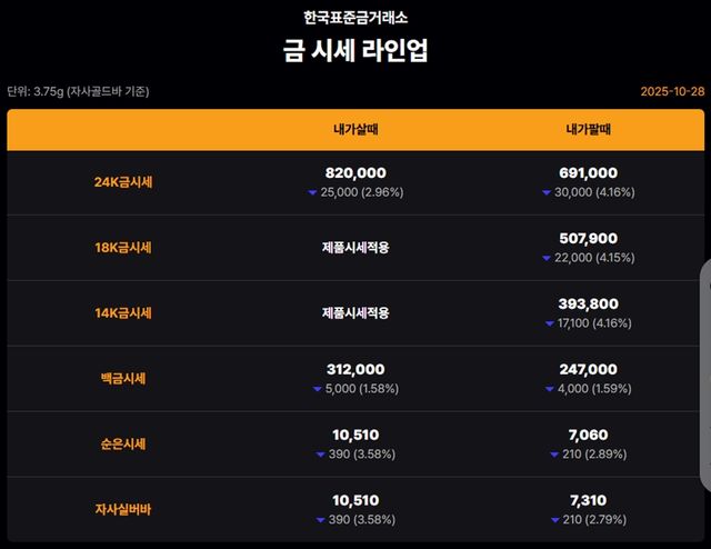 국내 금시세(금값)가 28일(한국 시각) 오후 하락세(전 거래일 대비)를 보이고 있다.