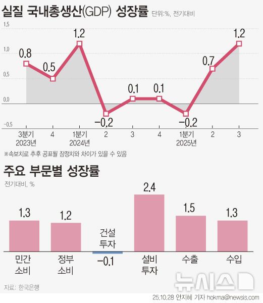 올해 3분기(7~9월) 우리나라 경제가 1.2% 성장하며 1년 6개월 만에 다시 1%대 성장률로 반등했다. 트럼프 행정부의 관세 여파에도 반도체와 승용차를 중심으로 수출이 호조세를 이어갔고, 민간소비는 새정부 출범에 따른 소비 심리 개선과 소비쿠폰 정책 효과에 3년래 최대폭으로 반등했다.