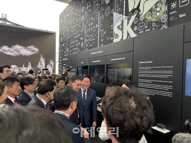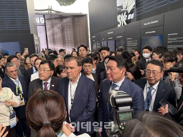 이날 최 회장과 가먼 CEO는 오후 12시 50분께 엑스포공원의 에어돔을 방문했다. 이들은 우선 SK그룹의 부스를 방문해 SK하이닉스의 고대역폭메모리(HBM), 인공지능(AI) 데이터솔루션 등을 직접 살폈다. 이들은 가이드의 설명을 주의 깊게 들으며 현장에 전시된 제품들을 세심하게 살폈다.