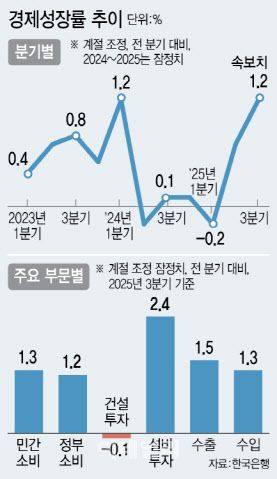 28일 한국은행이 발표한 올해 3분기 실질 국내총생산(GDP) 속보치에 따르면 전기 대비 성장률은 1.2%로 집계됐다. 이는 지난 2분기 이후 2개 분기 연속 성장세이며, 지난 2024년 1분기 1.2% 성장률 이후 1년 반 만의 최고치다. 지출 항목별 기준 내수(소비+투자)와 순수출(수출-수입)의 성장 기여도는 각각 1.1%포인트, 0.1%포인트를 차지했다.