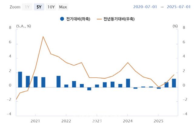 정부는 이날 3분기 성장률에 대해 “내부 전망보다 확실히 좋은 수치”라며 “미·중, 한미 간 관세협상 등 불확실성이 남아 있지만 연간 1.0% 달성 가능성이 높아졌다”고 밝혔다.