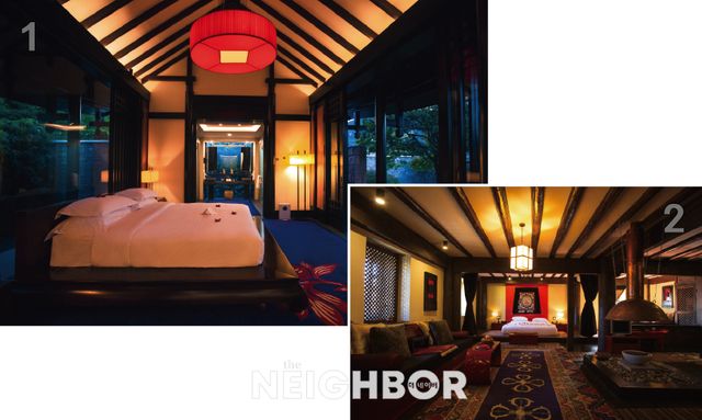 1 반얀트리 리장 마운틴 뷰 풀빌라 객실 내부. 2 반얀트리 링하 티베탄 스파 생츄어리 객실 내부.