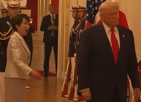 도널드 트럼프 미국 대통령이 미일 정상회담을 앞두고 국기 앞 촬영 지점을 찾지 못하는 해프닝이 벌어졌다. 다카이치 사나에(高市早苗) 일본 총리는 트럼프 대통령의 행동에 당황한 듯 입을 크게 벌리는 모습이 카메라에 포착됐다.