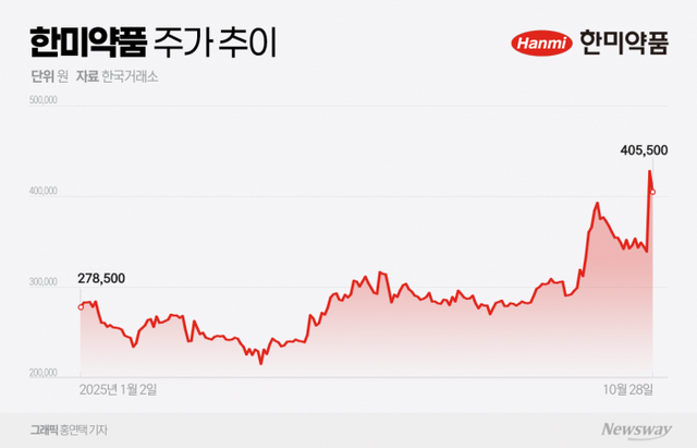28일 한국거래소에 따르면 이날 한미약품은 전 거래일 대비 5.26% 내린 40만5500원에 거래를 마쳤다. 전일 26% 넘게 폭등하며 거래대금 3조원을 돌파했으나, 단기 차익실현 매물이 출회되며 장중 40만원 선이 깨지기도 했다. 숨고르기 장세에도 불구하고 올해 초(1월 2일) 27만8500원에서 출발한 한미약품 주가는 약 46% 상승했다.