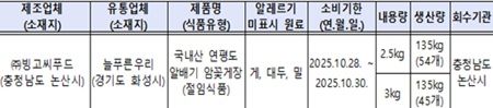회수 대상은 알레르기 유발물질 표시대상인 ‘게, 대두, 밀’을 원재료를 사용했음에도 해당 원재료를 표시하지 않은 아래 제품이다.