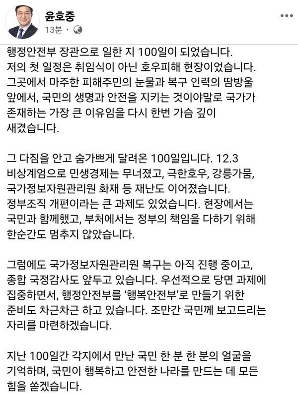 뉴시스 보도에 따르면, 윤 장관은 이날 자신의 페이스북에 "행안부 장관으로 일한 지 100일이 됐다"며 "첫 일정은 취임식이 아닌 호우피해 현장이었다"고 적었다.