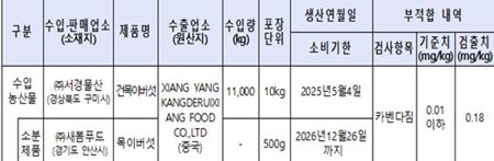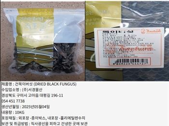 회수 대상은 ‘㈜서경물산(경상북도 구미시)’이 수입한 중국산 목이버섯과 이를 ‘㈜새봄푸드(경기도 안산시)’가 소분한 제품이다.