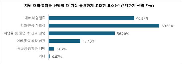 조사 결과 수험생들은 대학·학과 선택 시 가장 중요하게 고려하는 기준(복수 응답) 1순위로 ‘학과·전공의 적합성’(60.6%)을 꼽았다. 이어 이어 ‘대학 네임밸류’(46.9%), ‘취업률 및 졸업 후 진로 전망’(36.2%) 순으로 조사됐다. 대학 간판보다는 적성·진로를 고려해 지원하는 수험생이 더 많다는 점을 보여주는 결과다. 대입 학생부종합전형의 확대와 진로 탐색 교육 강화도 영향을 미친 결과로도 풀이된다.
