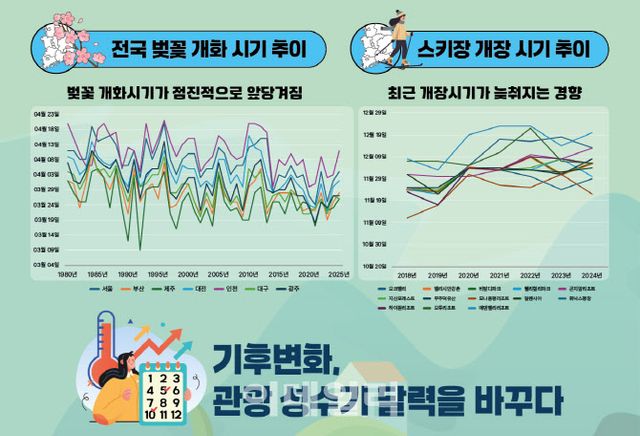 [이데일리 이민하 기자] 기온이 오르면서 벚꽃 개화는 앞당겨지고 스키장 운영 기간은 줄어드는 등 기후변화가 관광 성수기 지형을 바꾸고 있는 것으로 나타났다. 한국관광공사는 최근 7년간 이루어진 기후변화가 관광수요에 미치는 영향을 분석해 29일 발표했다. 공사는 기후 데이터와 이동통신 기반 관광데이터를 결합해 관광지 유형별 방문객 수 변화를 2018~2021년과 2022~2024년으로 나눠 기온이 1도 상승할 때 나타나는 방문객 수 변화 추이를 살펴봤다.