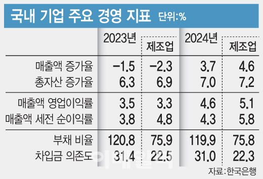 한국은행이 29일 발표한 ‘2024년 연간 기업경영분석 결과’에서 국내 비금융 영리법인기업(96만 1336개)의 지난해 실적을 분석한 결과 성장성의 대표 지표인 매출액증가율은 3.7%로, 2023년 -1.5%에서 플러스(+)로 전환했다.