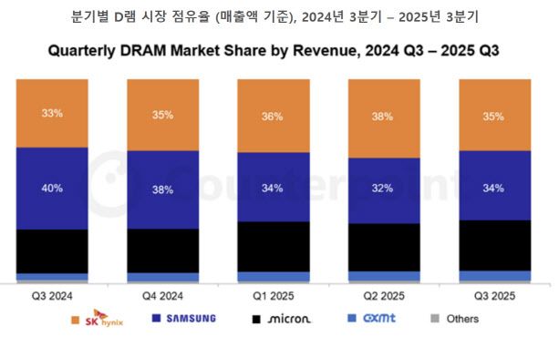 29일 시장조사업체 카운터포인트리서치에 따르면 SK하이닉스는 올해 3분기 SK하이닉스의 매출 기준 D램 시장 점유율은 35%로 1위를 유지했다. 2위는 삼성전자(005930)로 점유율 34%였다.