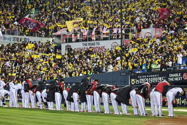 27일 서울 송파구 잠실야구장에서 열린 프로야구 2025 신한 SOL뱅크 KBO 포스트시즌 한국시리즈 2차전 한화 이글스와 LG 트윈스의 경기, LG 선수들이 13대 5 승리 뒤 관중에게 인사하고 있다. 기사 이해를 돕기 위한 자료 사진 / 뉴스1