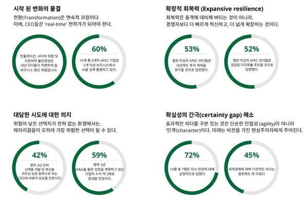 보고서에 따르면 CEO들은 불확실성 속 핵심 경영 키워드로 '확장적 회복력'을 꼽았다. 이는 불확실성과 위기를 단순히 대응하는 수준을 넘어 새로운 목표와 성장 기회로 전환하는 적극적 리더십을 뜻한다.