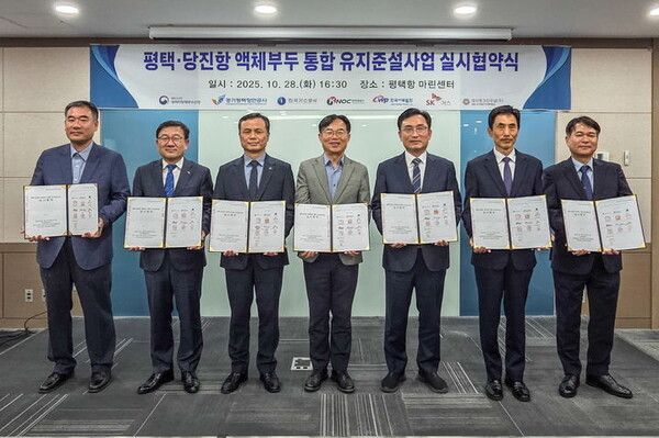 한국가스공사 평택기지본부는 전날(28일) 평택항 마린센터에서 6개 지역 유관기관과 안전하고 효율적인 항만 운영을 위한 평택·당진항 액체화물 취급 부두(액체부두) 통합 유지준설 사업 실시 협약을 체결했다고 29일 밝혔다.
