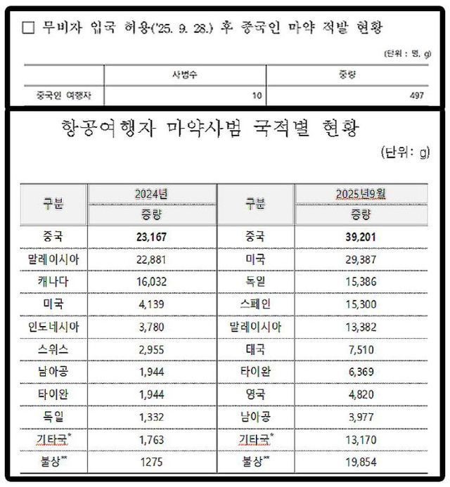 이어 “적발된 마약량만 2022년 5626g에서 2025년 9월까지 3만9207g(약 47억 원 규모)”이라며 “무비자 입국이 시행된 9월 28일 이후 한 달 만에 10명의 중국인 마약사범이 추가 적발됐다”고 지적했다.
