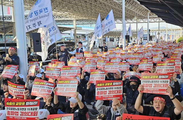 전국공항노조는 이날 오후 3시께 민주노총 인천공항지부와 함께 김해공항 국내선 청사 앞에서 총파업 결의대회를 열었다. 조합원 500여명이 참여했다.