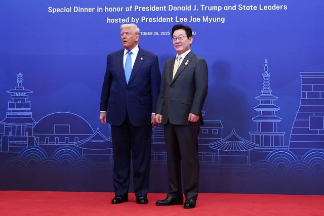 이재명 대통령이 29일 경북 경주 힐튼호텔 그랜드볼룸에서 열린 대통령 주최 정상 특별만찬에 앞서 도널드 트럼프 미국 대통령을 영접하고 있다. 연합뉴스
