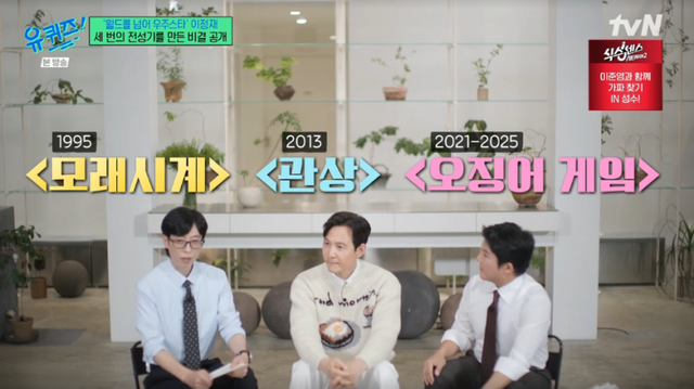 유재석은 “10년 전 이정재에게 전성기에 대해 물었을 때 ‘나에겐 항상 지금 이 순간이 전성기’라고 답했다더라”며 “지금은 그 생각이 어떠냐”고 물었다. 이에 이정재는 “시간을 돌이켜보면 오늘이 가장 즐겁고 의미 있는 날이 아닌가 싶다”고 대답했다.