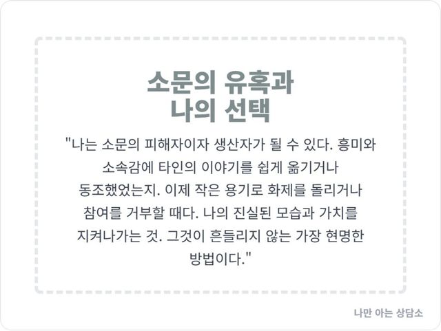 타인의 말 한마디에 일희일비하기보다, 나의 진실된 모습과 내가 소중히 여기는 가치를 묵묵히 지켜나가는 것. 그것이야말로 소문의 바람 속에서도 흔들리지 않는 나만의 닻을 내리는 가장 현명한 방법일 것입니다.