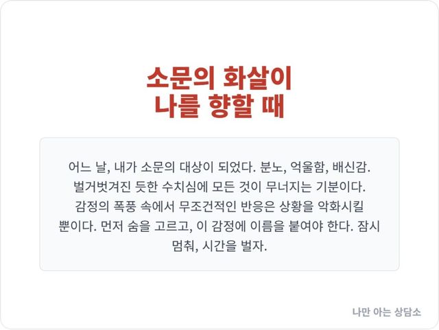 억울한 마음에 당장이라도 달려가 따지고 싶거나, 나를 방어하기 위해 또 다른 소문을 퍼뜨리고 싶은 유혹이 들 수 있습니다. 하지만 감정에 휩쓸린 반응은 상황을 악화시킬 뿐입니다.