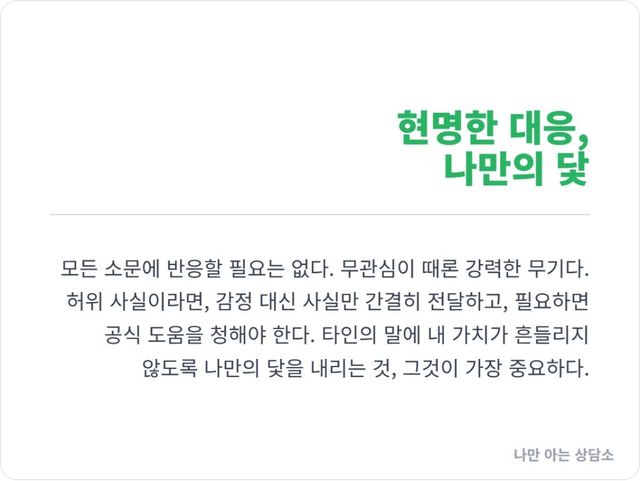외부의 소문에 어떻게 대응하는가 만큼이나 중요한 것은, 이 힘든 시간 동안 나 자신의 마음을 어떻게 돌보는가입니다. 타인의 말 한마디에 나의 가치가 흔들리지 않도록 내면의 중심을 잡는 것이 무엇보다 중요합니다.