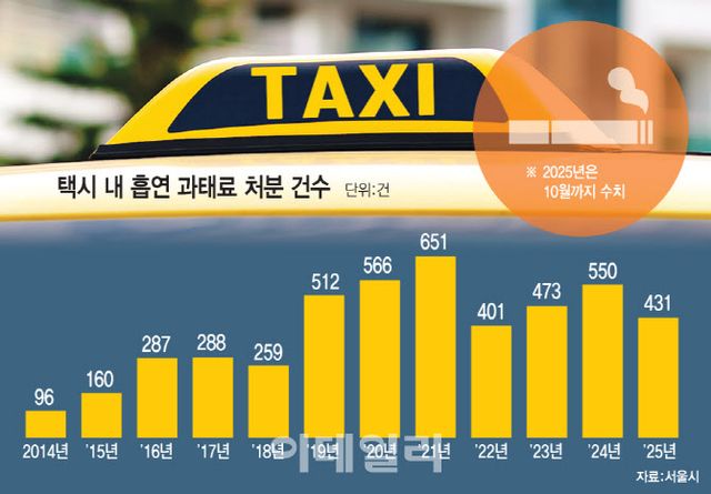29일 서울시에 따르면 택시 내 흡연으로 처분을 받은 건수는 늘어나는 모습이다. 국토교통부는 지난 2014년 승객 여부와 관계없이 차내 흡연 시 10만원의 과태료를 부과키로 한 여객자동차운수사업법 시행규칙을 시행했다. 그 해의 처분 건수는 96건이었다. 이어 2015년 160건, 2016년 287건, 2017년 288건, 2018년 259건 수준을 보였다.