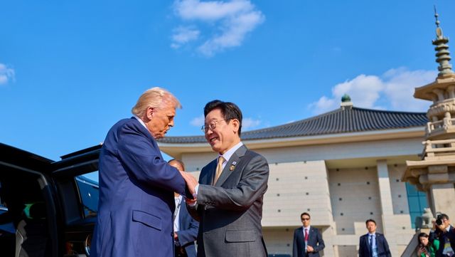 이재명 대통령이 29일 경북 경주박물관에 도착한 도널드 트럼프 미국 대통령과 악수하고 있다. / 대통령실, 뉴스1