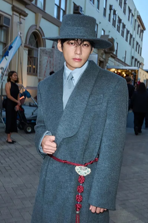 이날 뷔는 한복의 곡선을 닮은 회색 롱 코트에 갓을 연상시키는 페도라를 착용했다. 특히 옥이 장식된 빨간 매듭 노리개가 전통미의 방점을 찍으며 눈길을 끌었다.