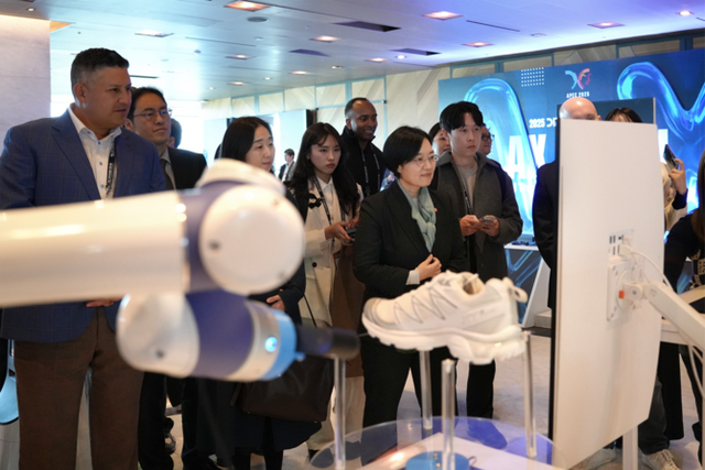 한성숙 중소벤처기업부 장관(가운데)이 스카이인텔리전스 기술 체험존에서 로봇암 기술 설명을 듣고 있다. ⓒ SKAI