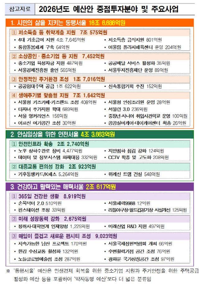이렇게 마련한 재원은 △안정된 삶의 기반을 위한 동행서울 △안심하고 누리는 일상을 위한 안전서울 △활력과 성장을 담은 매력서울 등 ‘3대 투자 중점’에 집중 투입한다.