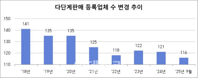 공정거래위원회가 30일 공개한 ‘2025년 3분기 다단계판매 주요정보 변경사항’에 따르면 지난 9월말 기준 다단계판매업 등록업체는 총 116개사로 전분기보다 1곳 줄었다.