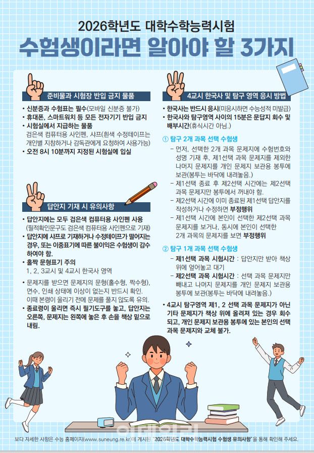 도교육청은 11월 10일부터 14일까지 ‘2026 수능 종합상황실’을 운영해 △시험 관리와 관련한 상황 처리 △문답 시 운송 및 보관 점검 △시험장 도감독관 배치 △수능 당일 비상 상황 대처 등 종합적인 역할을 수행할 계획이다.