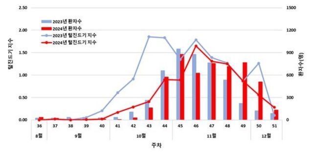 털진드기 지수와 쯔쯔가무시증 환자수(2023~2024년) / 질병관리청 제공