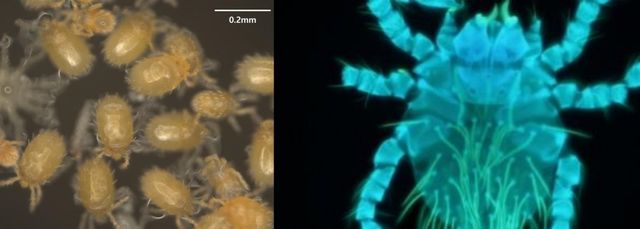 털진드기 유충 실체현미경 사진(왼쪽), 활순털진드기 형광현미경 사진 (오른쪽) / 질병관리청 제공