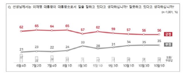 해당 조사 결과에 따르면, 이 대통령의 국정 운영을 ‘잘하고 있다’고 응답한 비율은 56%로, 2주 전과 같은 수치를 기록했다. 부정 평가도 35%로 2주 전과 같은 지지율을 기록했다. 연령별로는 30~50대에서 긍정 평가가 높게 나타났다. 이념성향별로 보면 진보층과 중도층에서는 긍정 평가가 각각 88%, 57%로 높은 반면, 보수층에서는 부정 평가가 65%로 높았다.