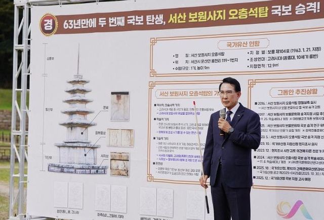 이완섭 서산시장은 30일 서산 보원사지 오층석탑 앞에서 기자회견을 열고, “63년 만에 우리 서산시에서 서산 보원사지 오층석탑의 국보 승격을 이뤄내며 두 번째 국보를 보유하게 됐다”라고 말했다.