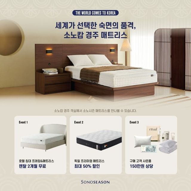 이를 기념해 소노시즌은 주요 국제회의 대표단이 체험한 침대를 소비자들이 합리적으로 마련할 수 있도록 특별 프로모션을 전개한다. 오는 11월31일까지 전국 직영점과 브랜드 스토어, 백화점 등 전체 오프라인 매장에서 풍성한 혜택으로 펼쳐진다.