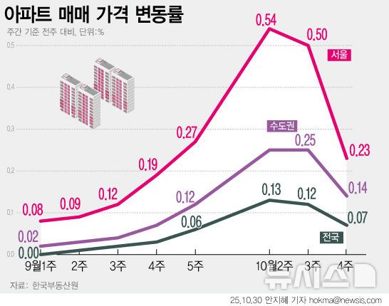 뉴시스 보도에 따르면, 30일 한국부동산원 10월 넷째 주 주간 아파트가격 동향 조사 결과에 따르면, 지난 27일 기준 전국(0.12%→0.07%)과 수도권(0.25%→0.14%) 아파트 매매가격은 전주 대비 상승폭이 감소했다.