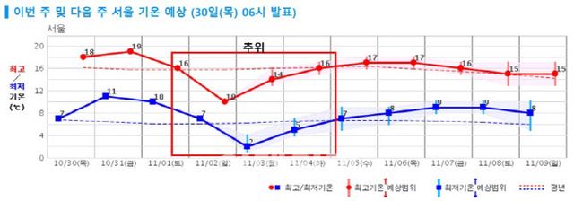 비가 그친 뒤에는 북서풍이 강하게 불고, 북쪽에서 찬 공기가 충돌하며 형성된 기압골이 전국을 지나가 기온이 급격히 떨어질 것으로 보인다. 급격히 떨어진 기온은 11월 1일 낮부터 4일까지 계속될 전망이다. 1~2일은 강한 바람 탓에 체감온도가 3~5도 정도 떨어지겠다. ‘복사냉각 현상’이 더해지는 3일 오전 서울 최저기온은 2도로 추위가 절정에 달할 것으로 예측됐다.