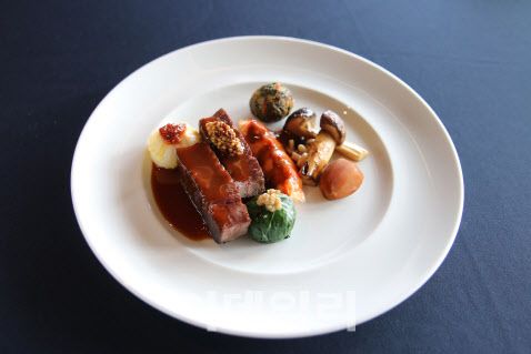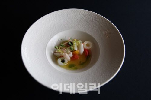 전채 요리는 동해 피문어, 남해 무뉘오징어, 포항 도미살로 구성된 해물 냉체였다. 여기에 남해 유자, 청송 사과식초, 캐나다 메이플시럽으로 만든 소스를 곁들였다.
