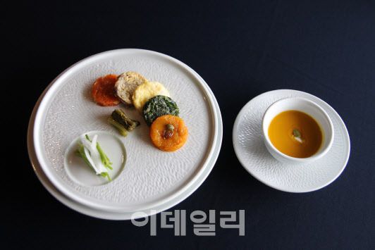두 번째 전채 요리는 부드러운 치즈 호박죽과 함께 광주 육전, 경주 단호박, 완도 광어, 평창 참나물, 전라 묵은지 등 국내 다섯 지역의 맛을 담은 오색전이 제공됐다.