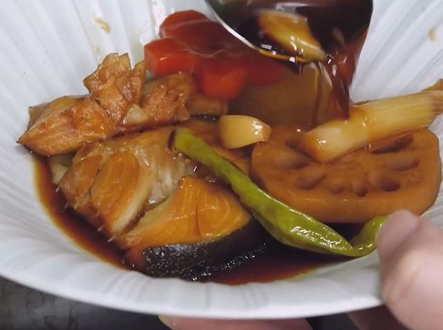 간장조림은 간장 한 컵, 미림 반 컵, 다시마 육수 세 컵, 설탕을 넣어 만들었다. 강불에 10분 정도 끓이고 중약불로 낮춘 다음 육수가 반 정도 줄어들 때까지 끓였다.