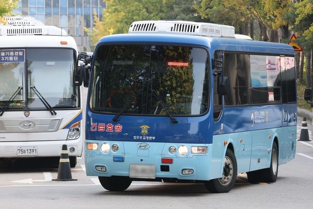 윤석열 전 대통령이 탑승한 호송차량이 30일 오전 서울 서초동 서울중앙지방법원에 도착한 모습. 이날 윤 전 대통령은 내란우두머리 혐의 재판에 약 넉달 만에 출석했다. / 뉴스1