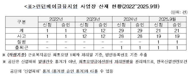더불어민주당 이학영 의원실이 30일 근로복지공단에서 제출받은 런베뮤 사업장 산재 현황을 보면, 설립 이후 산재신청 수는 2022년 1건, 2023년 12건, 2024년 29건, 2025년 1~9월 21건 등 총 63건이고 모두 승인됐다. 유형별로는 사고 60건, 출퇴근 2건, 질병 1건 등이었다.