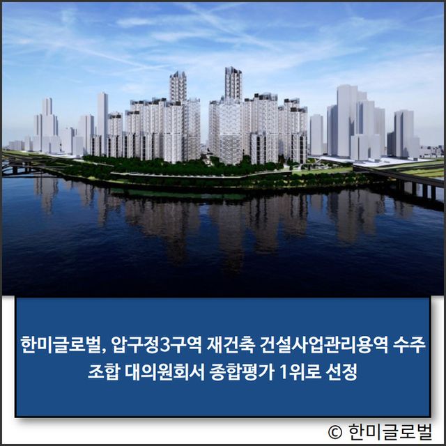 한미글로벌관계자는 "복잡한 이해관계와 대규모 도시정비사업일수록 전문 PM·CM의 역할이 중요하다"며 "글로벌 CM사인 한미글로벌의 축적된 노하우를 바탕으로 압구정 3구역의 위상에 걸맞은 성공적인 사업 추진을 할 것은 물론, 국내를 넘어 세계적인 위상의 단지가 될 수 있도록 최선을 다 하겠다"고 전했다.