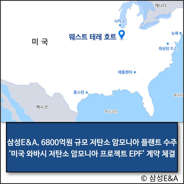 삼성E&A는 미국 와바시 밸리 리소스(Wabash Valley Resources)와 '미국 와바시 저탄소 암모니아 프로젝트 EPF(Engineering·Procurement·Fabrication, 설계·조달·제작)'에 대한 계약을 체결했다고 30일 공시를 통해 밝혔다. 창사 이래 첫 저탄소 암모니아 플랜트 수주로, 계약금액은 약 6800억원(미화 약 4억7500만달러)이며, 계약기간은 30개월이다.